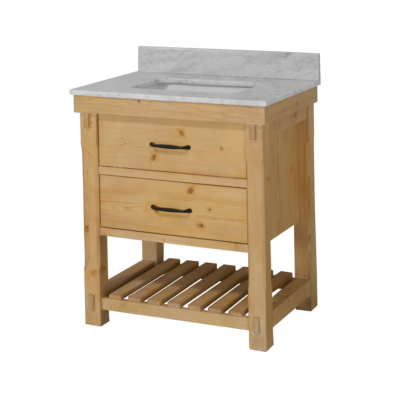 The Birmingham: modern rustic beauty. Each one-of-a-kind vanity features a polished Carrara marble countertop, handcrafted open-shelf cabinet, and distinctive black metal hardware. Our unique wire-brushing technique results in an organic, distressed appearance that highlights each cabinet's individual knots and grains.