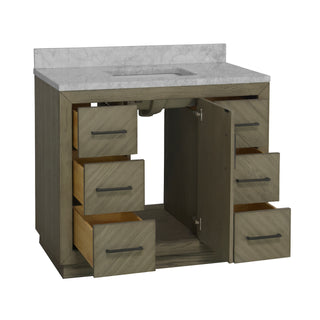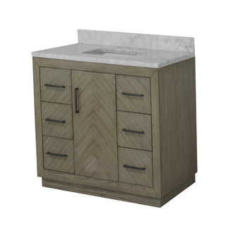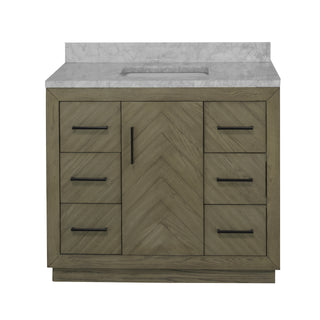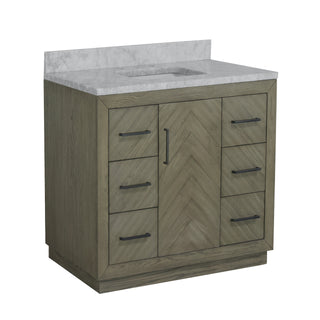 Elevate your space with the timeless design of the Peyton bathroom vanity. This exquisitely crafted bathroom vanity features a classic herringbone design made of interlocking planks of refined veneer. Includes a polished Italian Carrara marble countertop thicker than one-inch, complimentary matching marble backsplash, and stunning metal hardware.