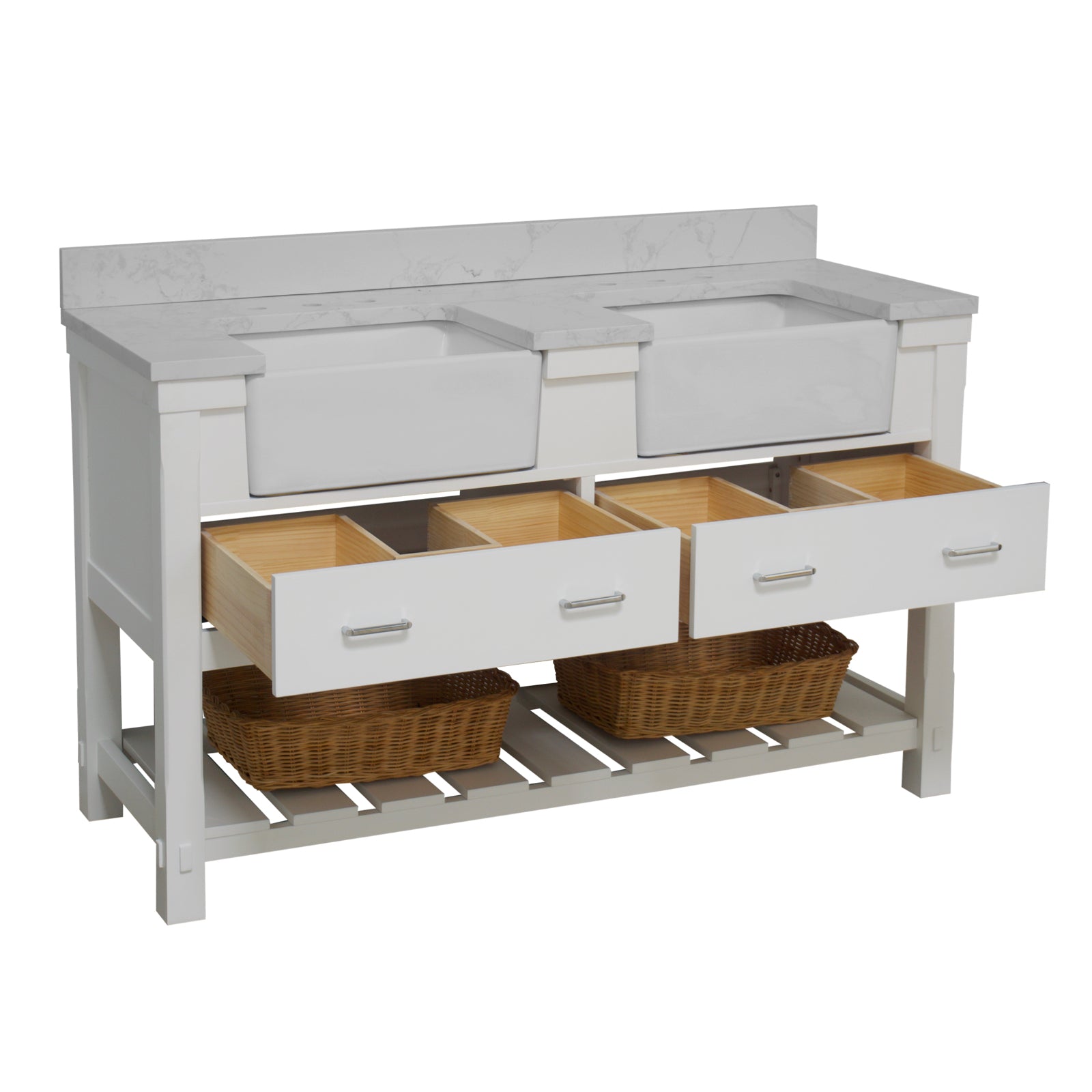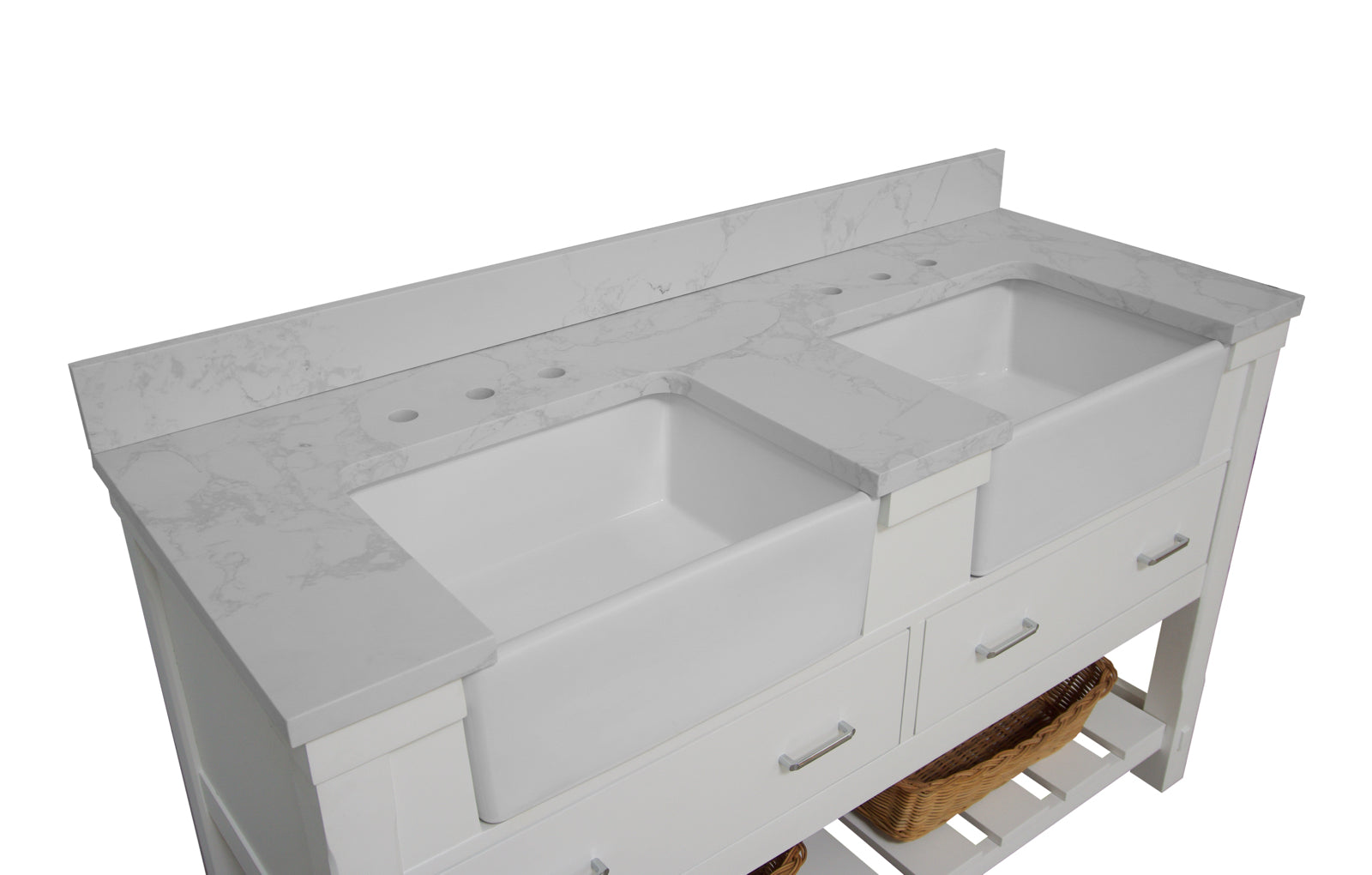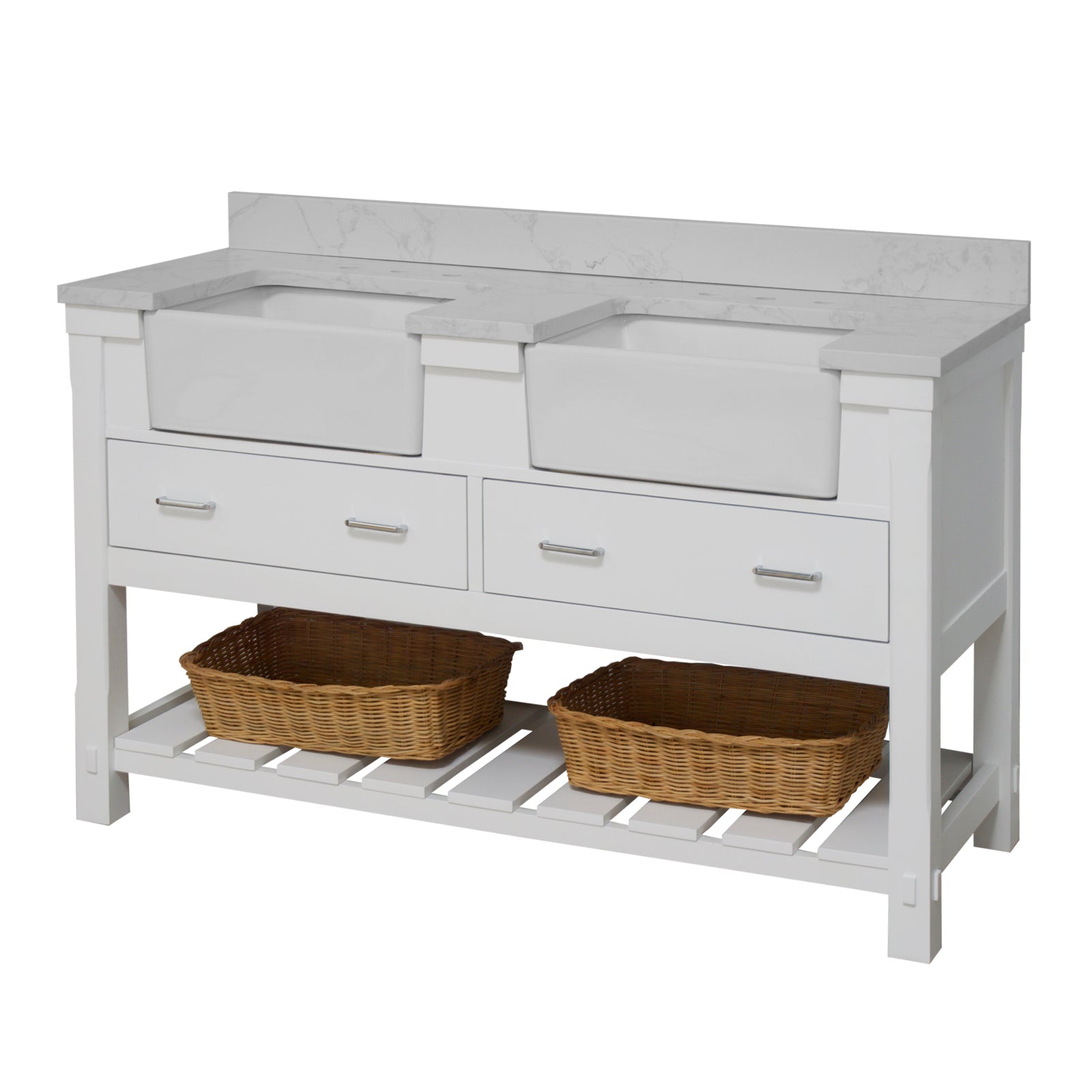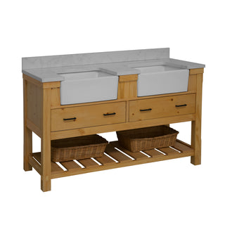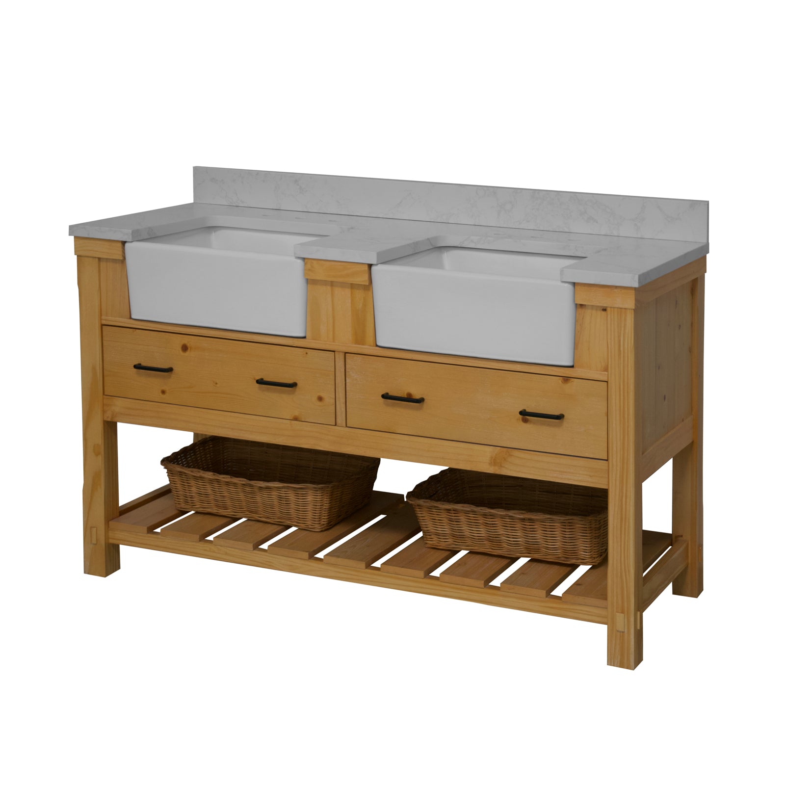 The Charlotte: vintage country style. This freestanding vanity cabinet features dual apron sinks and an open shelf to store towels, soaps, and other essentials.