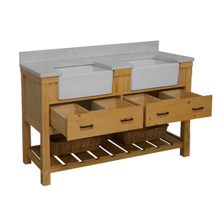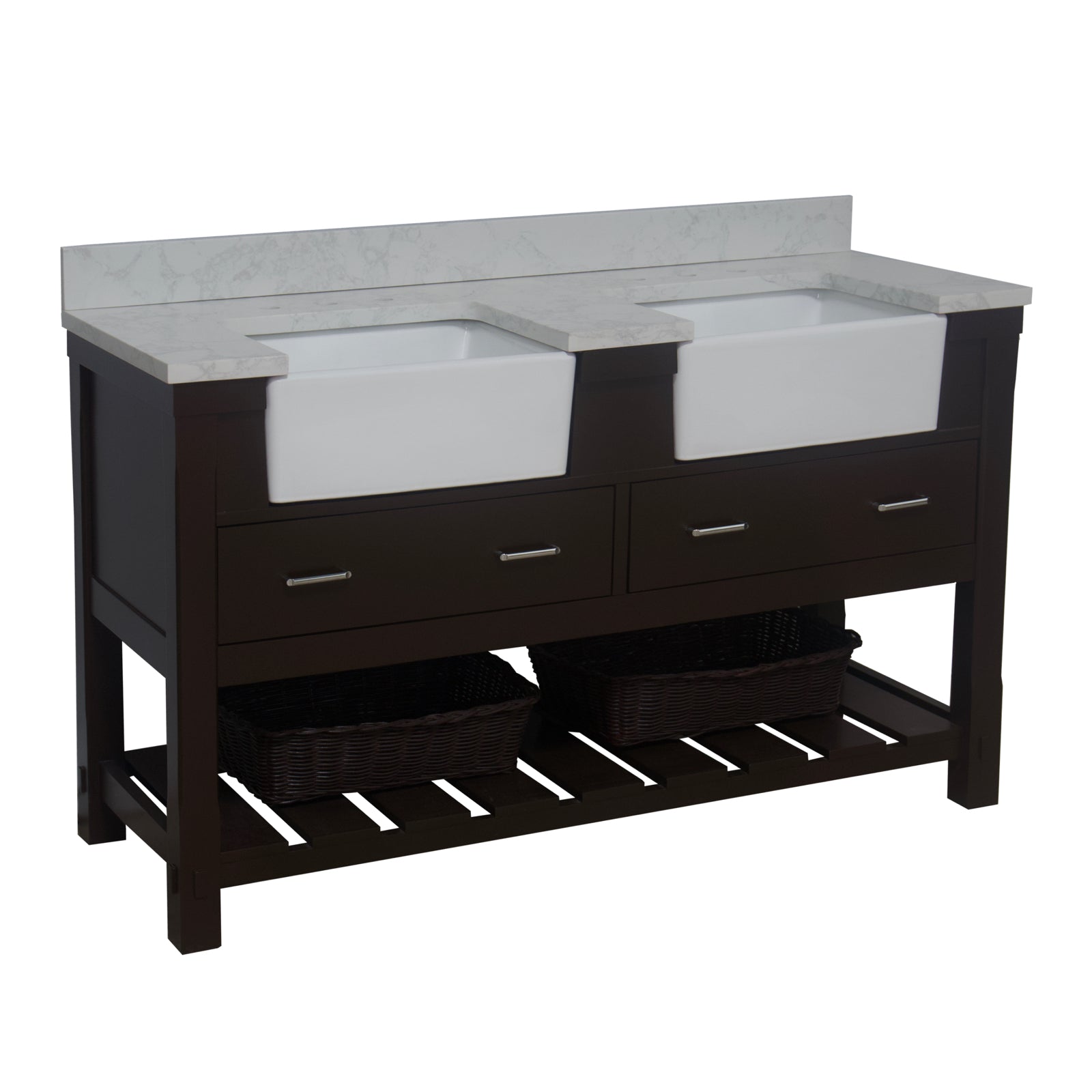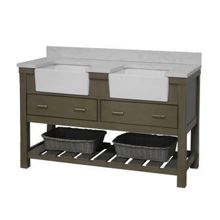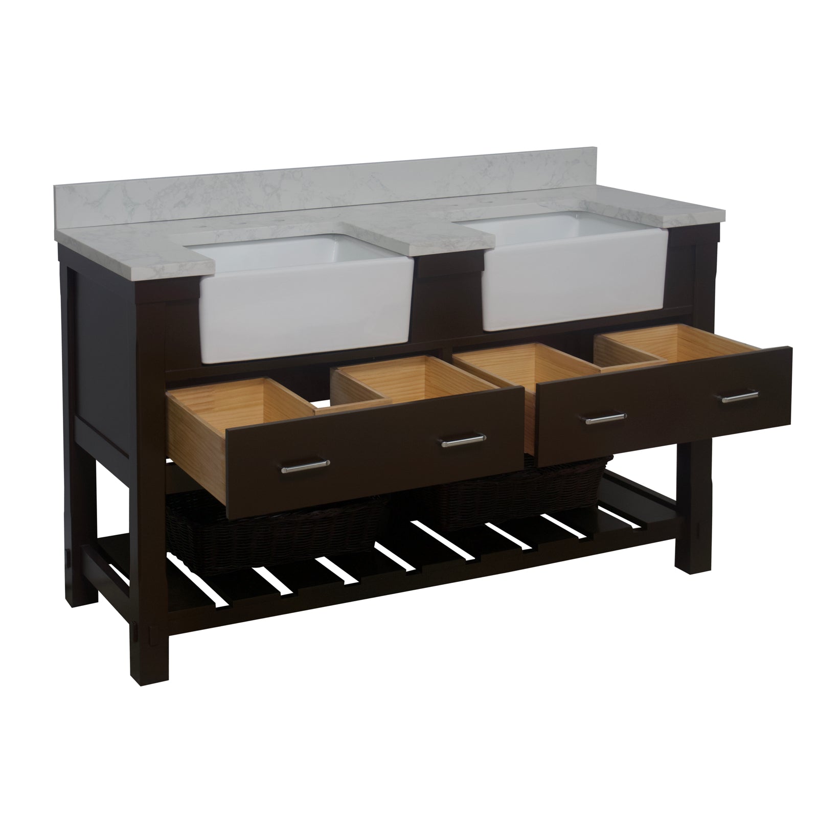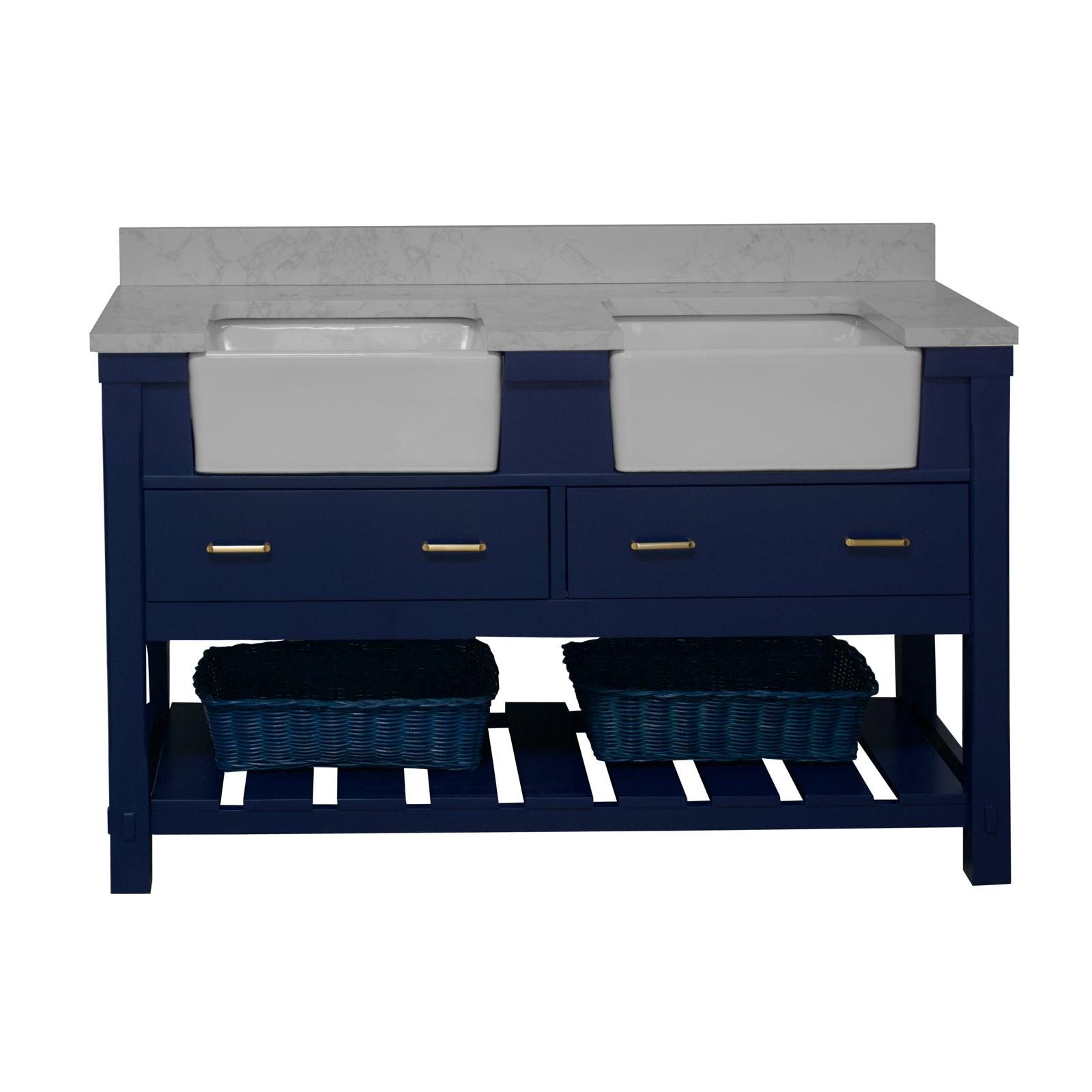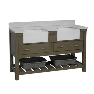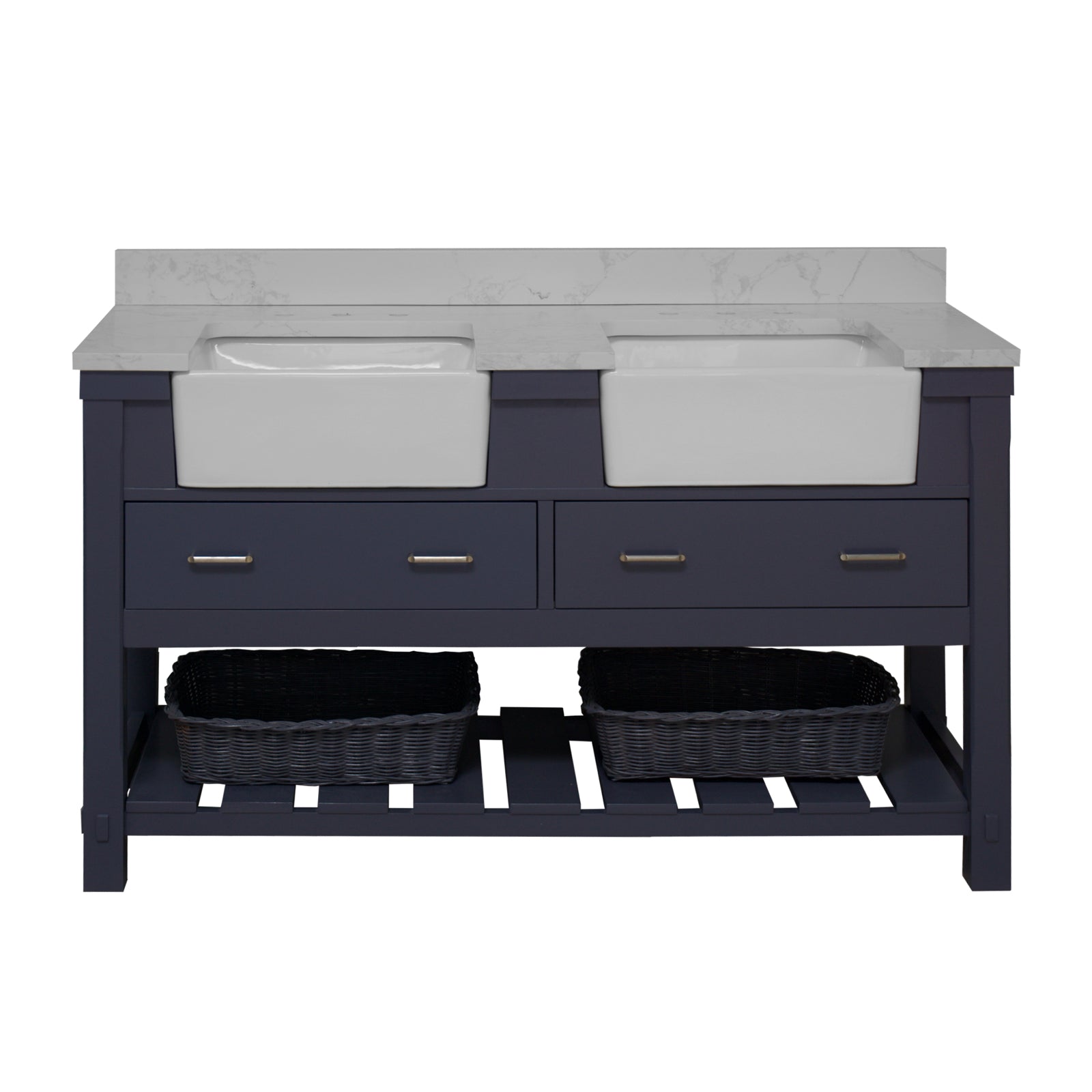 The Charlotte: vintage country style. This freestanding vanity cabinet features dual apron sinks and an open shelf to store towels, soaps, and other essentials.