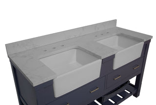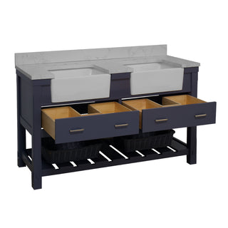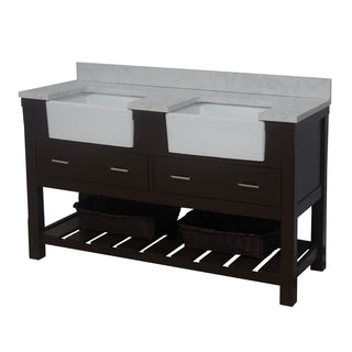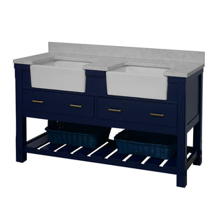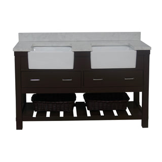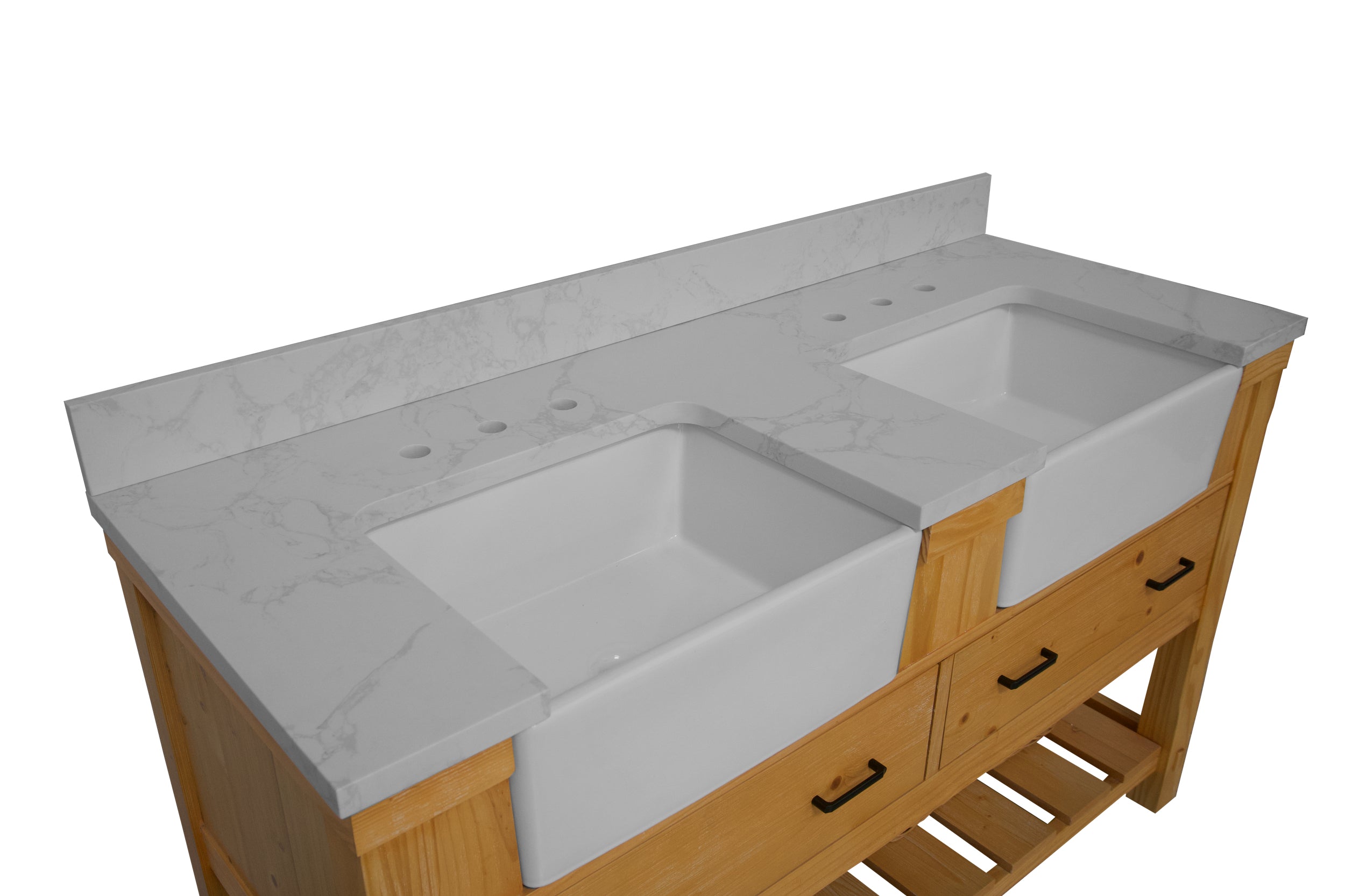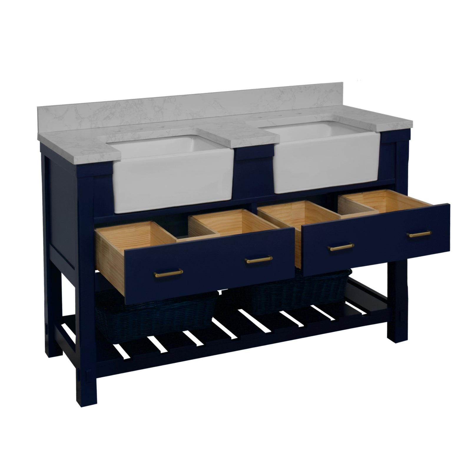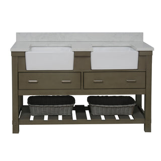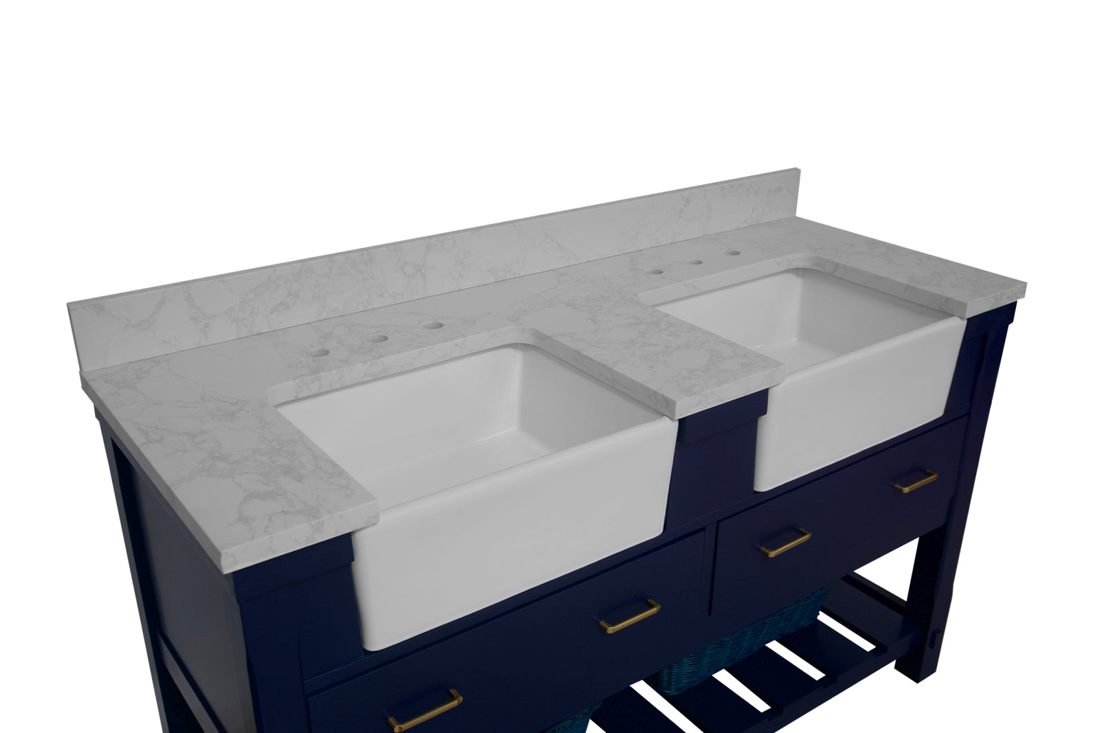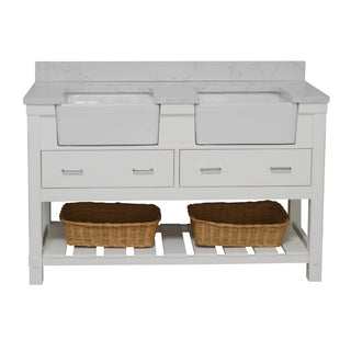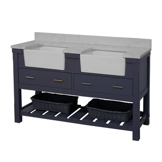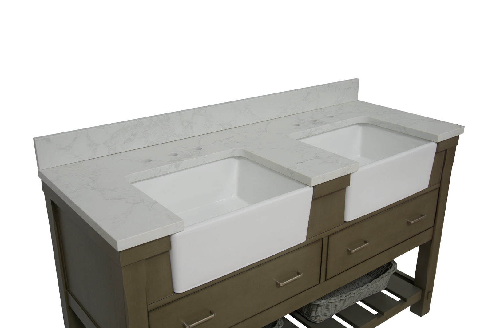The Charlotte: vintage country style. This freestanding vanity cabinet features dual apron sinks and an open shelf to store towels, soaps, and other essentials.