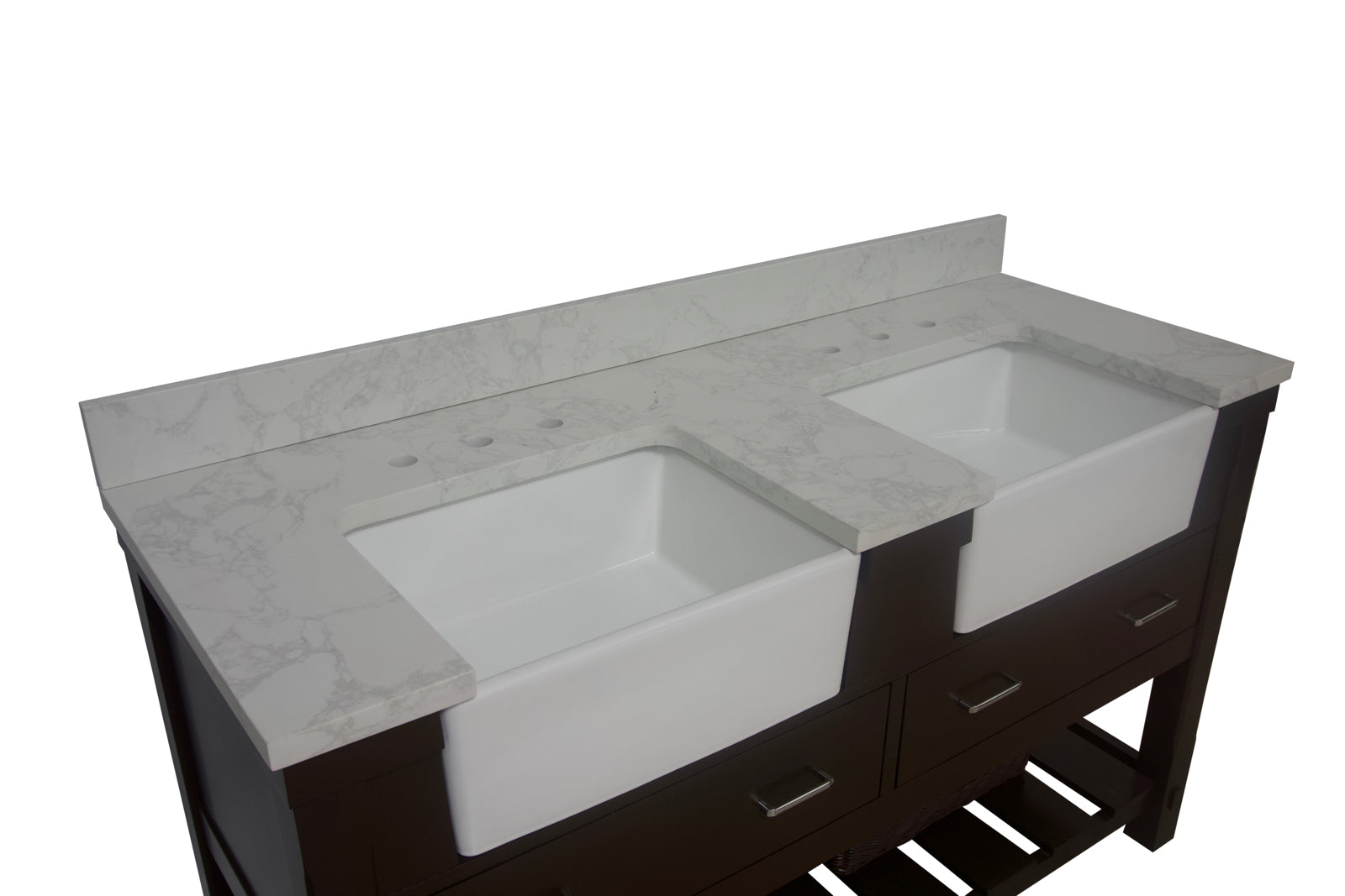 - Engineered Carrara top with beautiful veining designed to resemble authentic Carrara marble. The countertop is an incredible 3 cm thick! That's more than one inch for a super high-end look!