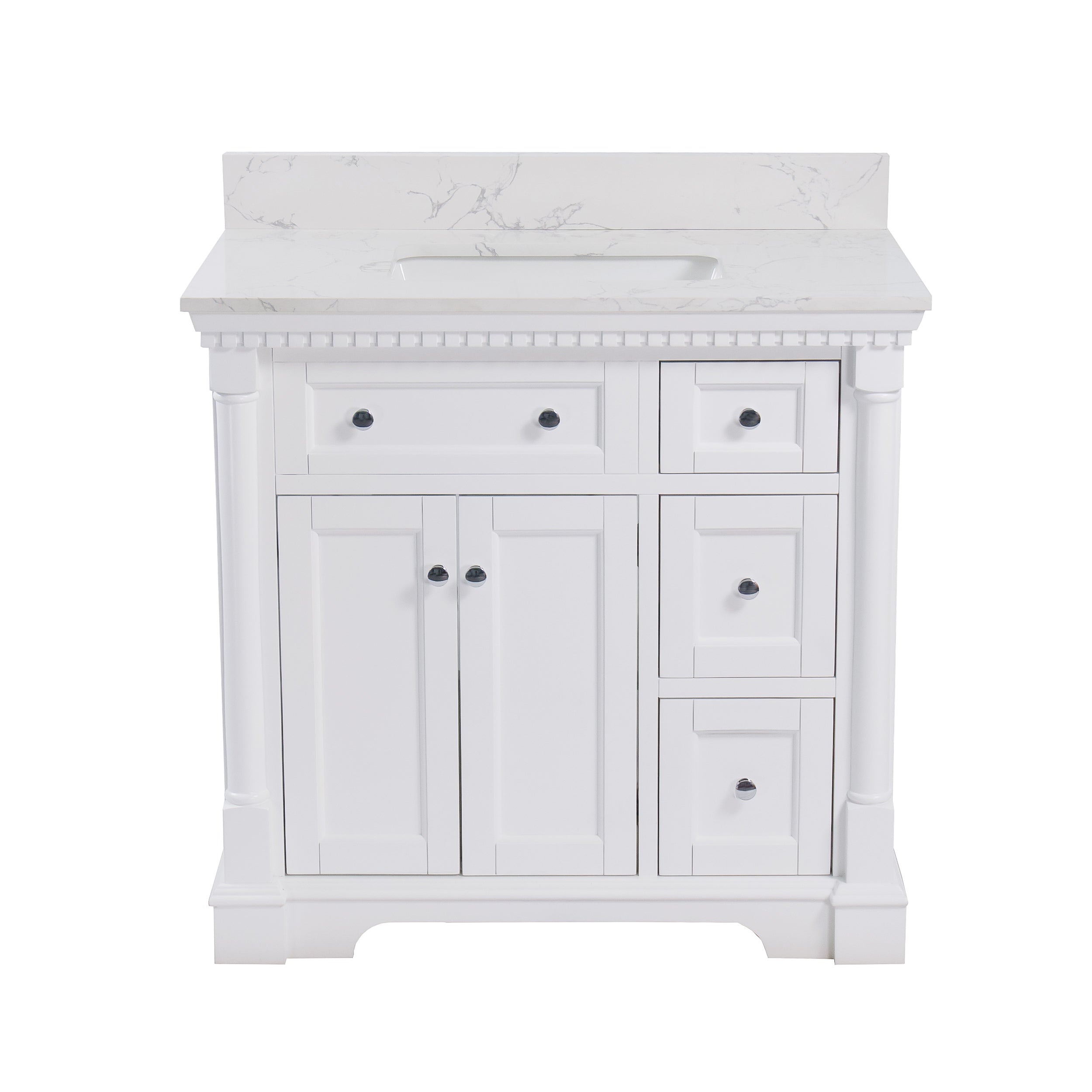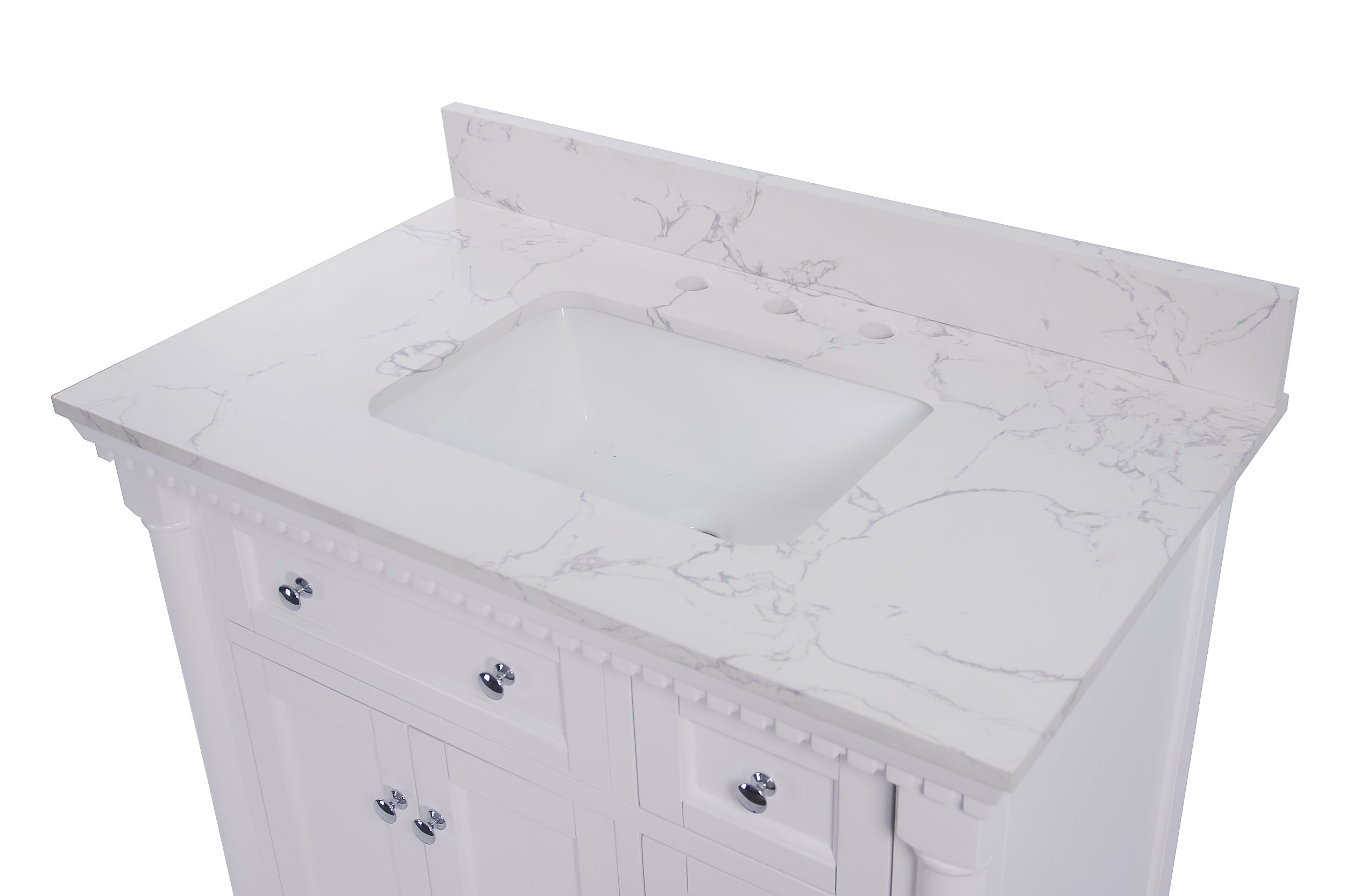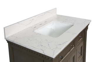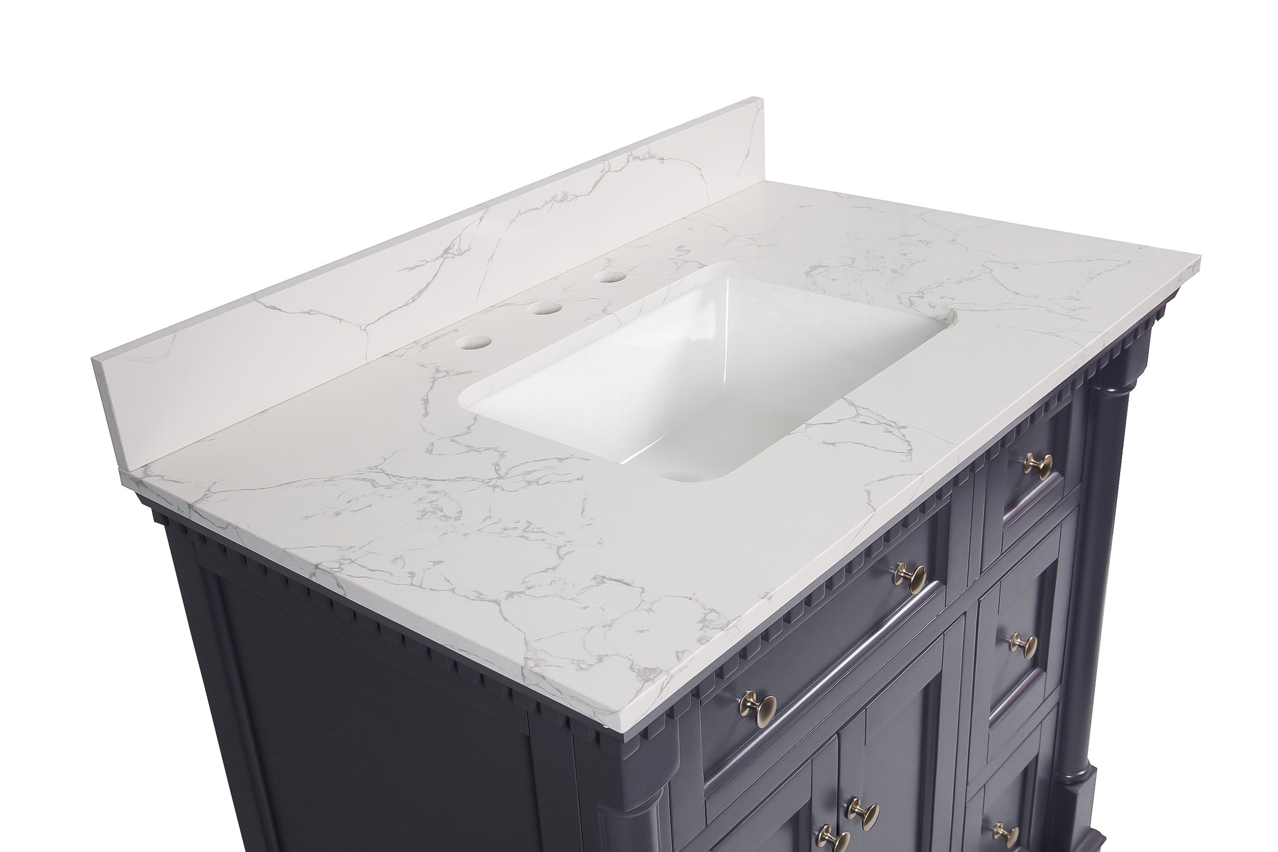 • Elegant Countertop: The engineered marble countertop, pre-installed on the cabinet, showcases stunning veining that mimics the look of authentic marble. It’s not only beautiful but also resilient and easy to maintain.