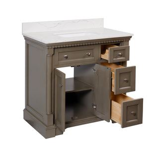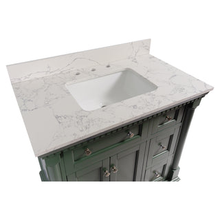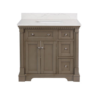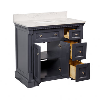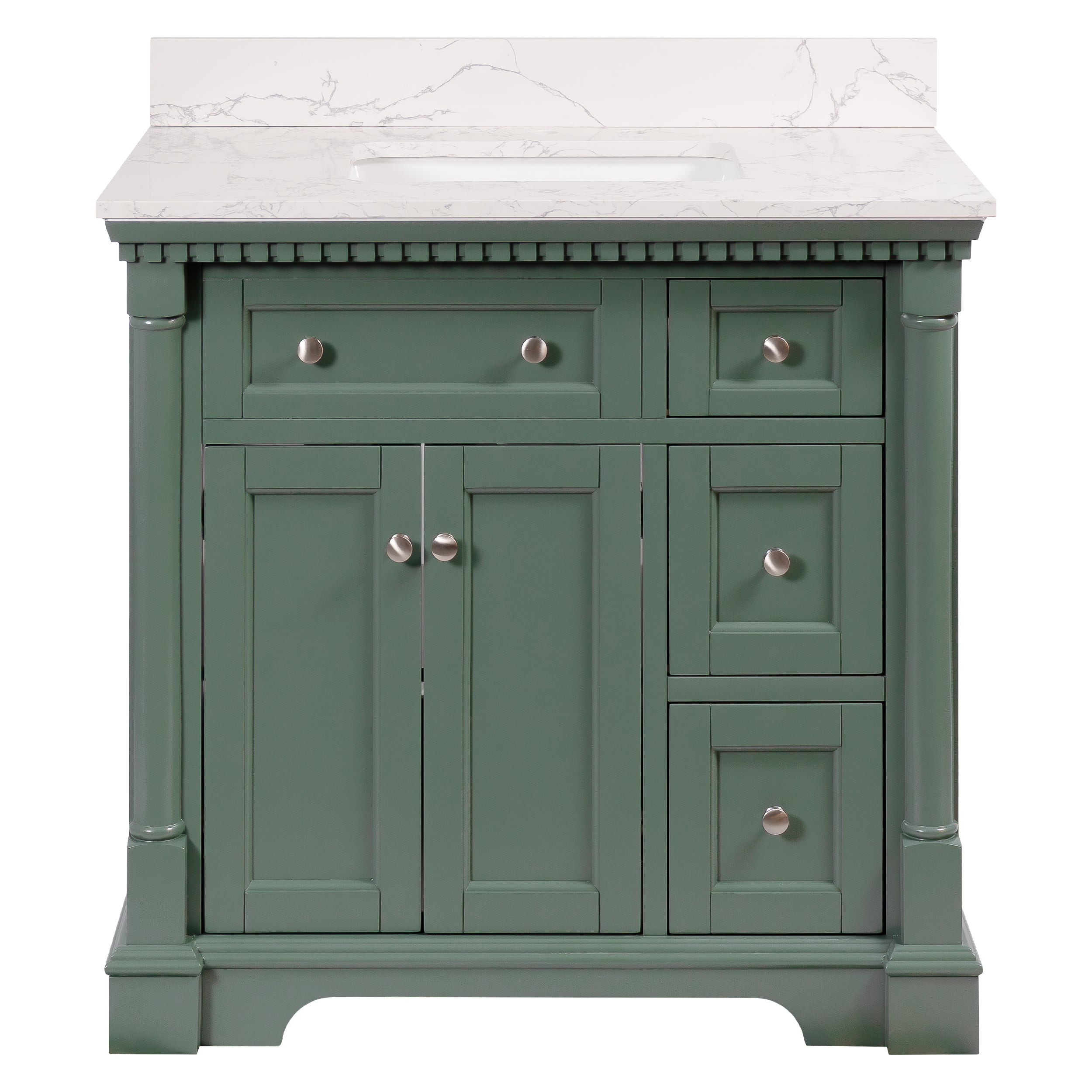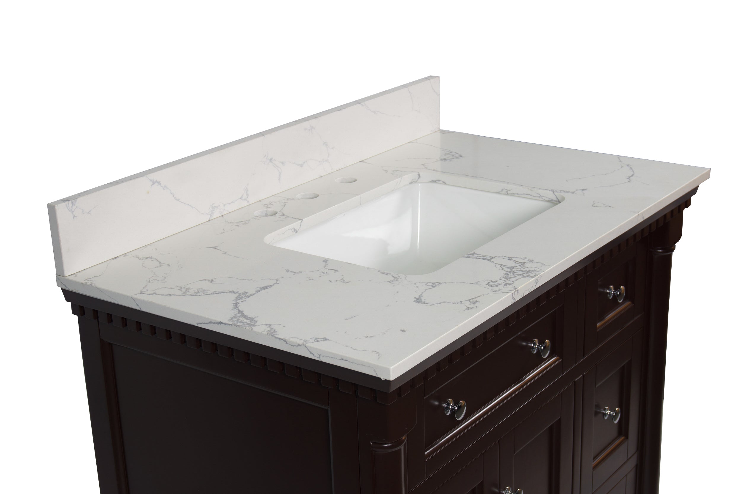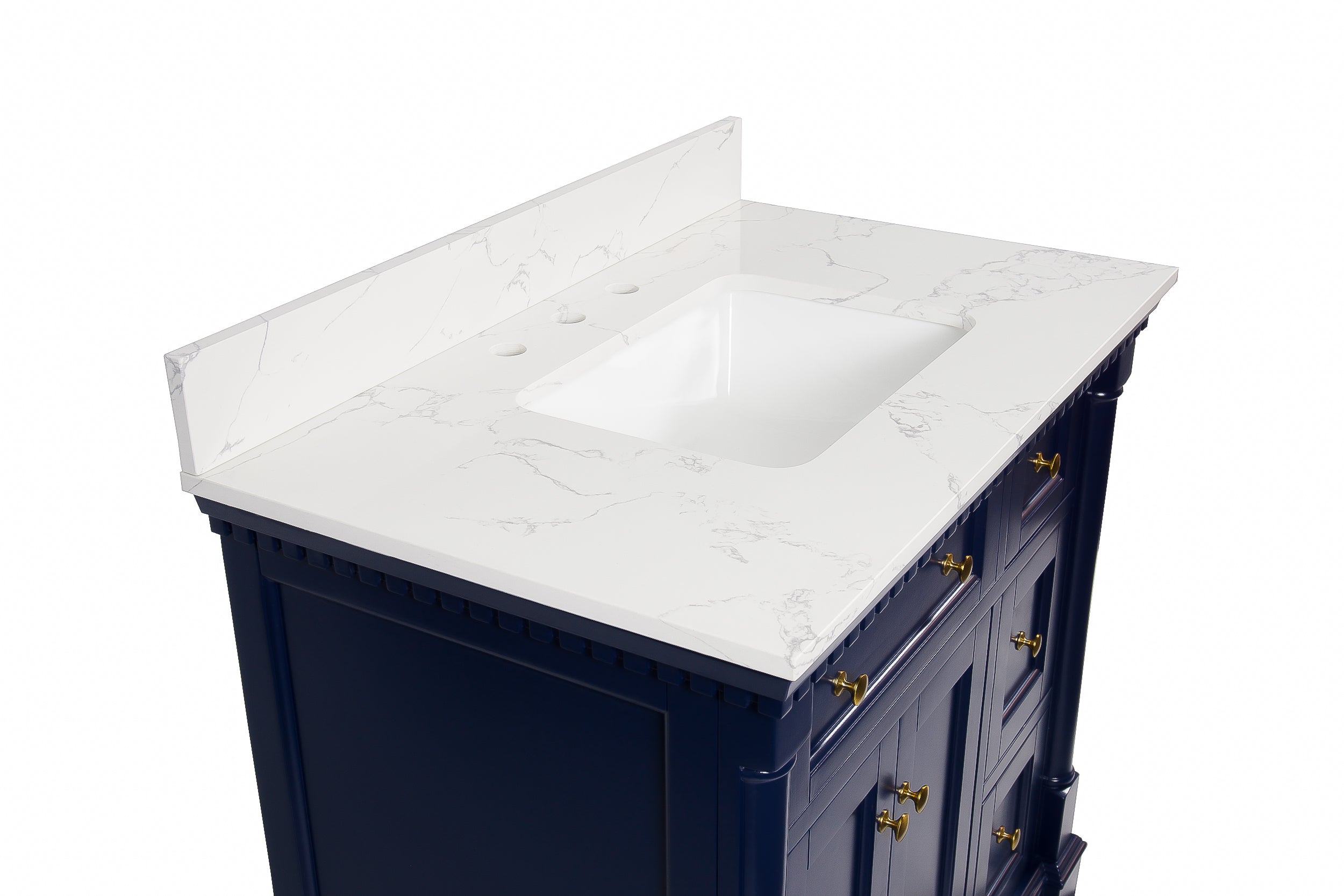 • Elegant Countertop: The engineered marble countertop, pre-installed on the cabinet, showcases stunning veining that mimics the look of authentic marble. It’s not only beautiful but also resilient and easy to maintain.